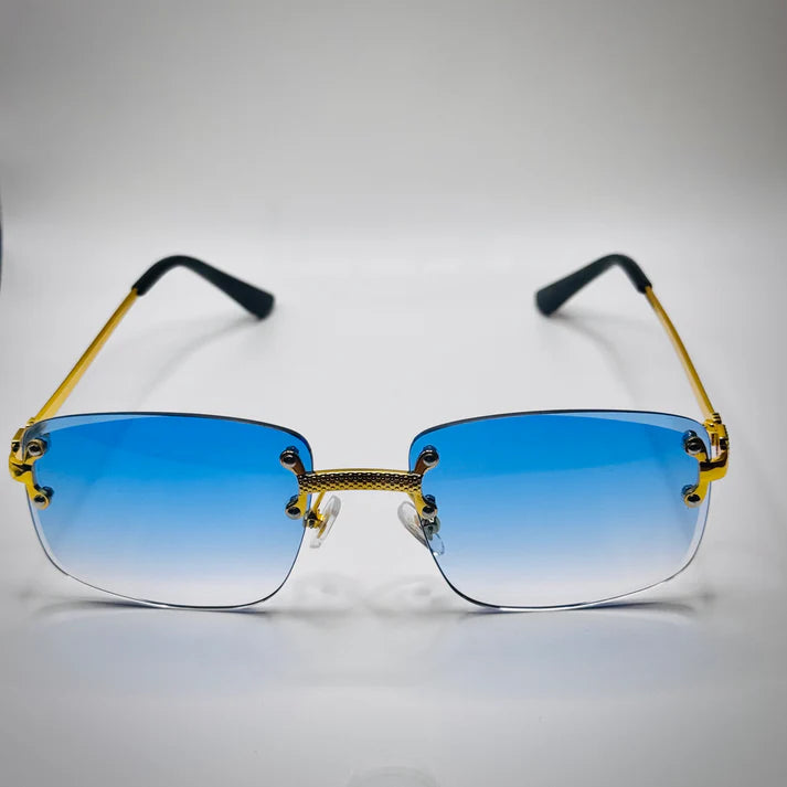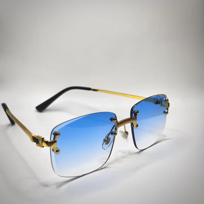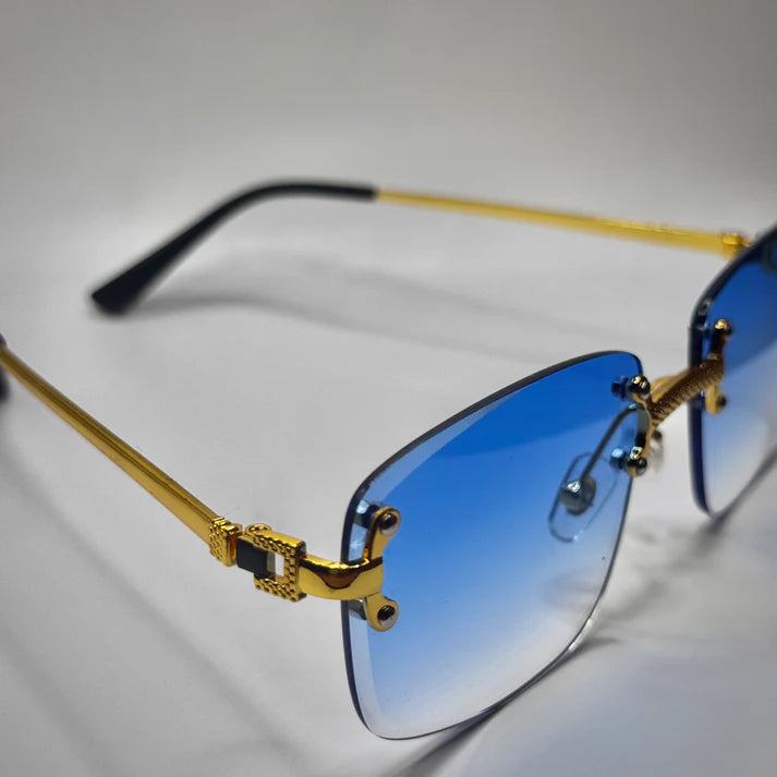 Affirmez votre présence avec ces lunettes de soleil sans monture au look audacieux et raffiné. Dotées de verres bleu foncé en forme géométrique et d’une monture en métal doré ultra-fine, elles offrent un équilibre parfait entre élégance et intensité. Leur style unisexe les rend idéales pour celles et ceux qui veulent marquer les esprits sans en faire trop.